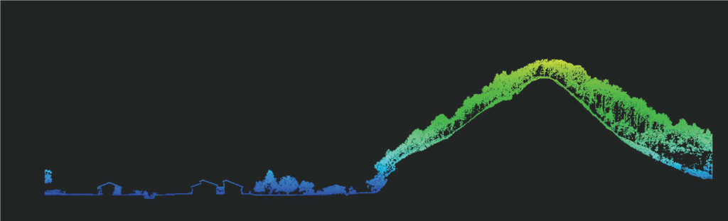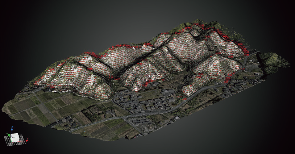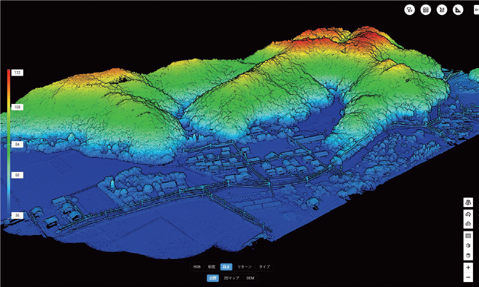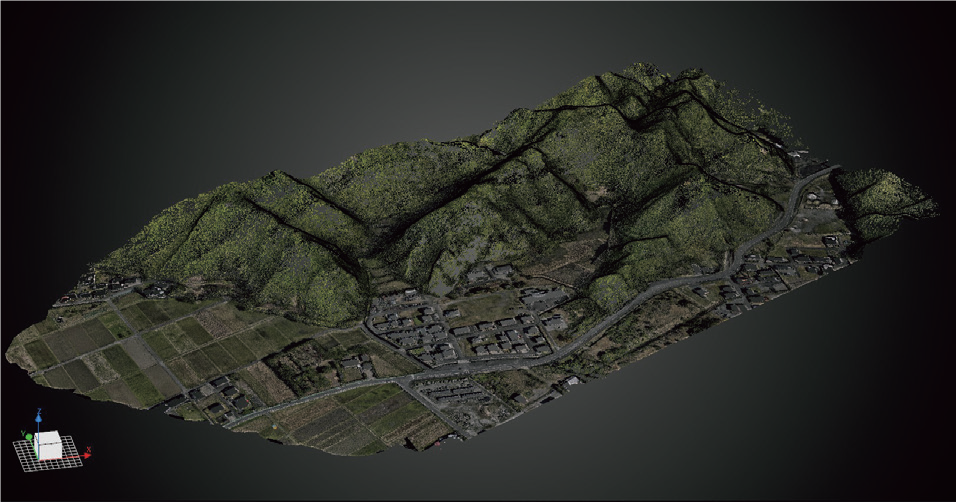 写真測量の場合、上空から連続した写真を移動しながら何枚も撮影し、それを画像解析ソフトに取り込むと、3次元の点群データが作成されます。レーザードローン測量は、上空から秒間120万個のレーザーを発射し地形などの計測を行います。このため精度はレーザードローンの方が上となりますので、写真測量は簡易的なオルソ画像を作成するなどとの使い分けをしています。特に山地や草地の場合、写真測量では樹木や草の高さを出すことは可能ですが、レーザードローンの場合は地表面の高さを出すことが可能です。