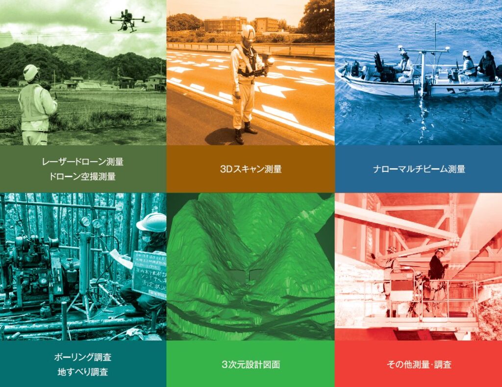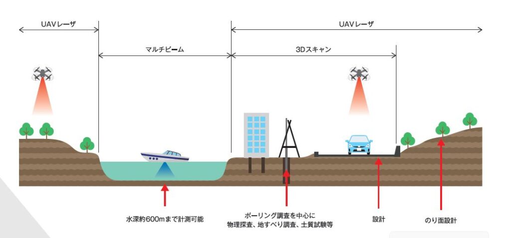 当社の強みとして空・陸・水中といったあらゆるシーンで3次元測量が可能で、さらに地中の調査(ボーリング等)や、それらのデータを基に設計まで行うことができます。