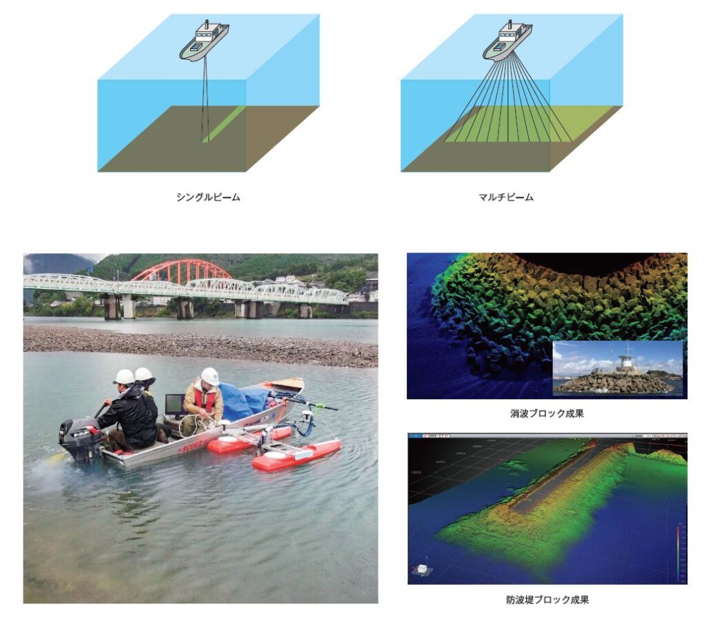 従来の水中の測量は、海底または河床をシングルビームで測量する点と線の成果物でしたが、ナローマルチビームでは船に取り付けたソナーから音響ビームを扇状に照射し面的に地形を計測します。